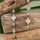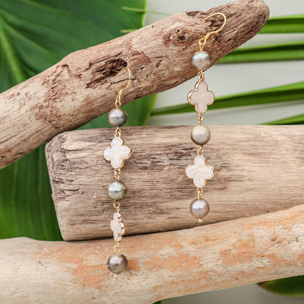 Each earring features a luminous Tahitian Pearl, accented by four-leaf clover motifs inlaid with pearl. Playful yet refined, they catch the light with every turn.