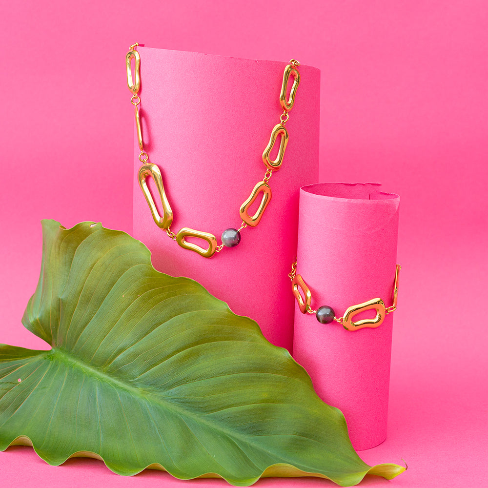 This statement necklace and bracelet set takes chunky chains to the next level with unique, oversized links that make every outfit feel instantly more powerful. Both pieces are finished with a single Tahitian pearl — placed slightly offbeat, because Rumi doesn’t do predictable.