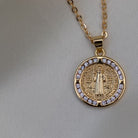 Featuring a radiant 9 mm pearl, this necklace is accented with a beautiful Saint Benedict medal - a symbol of protection and prayer.