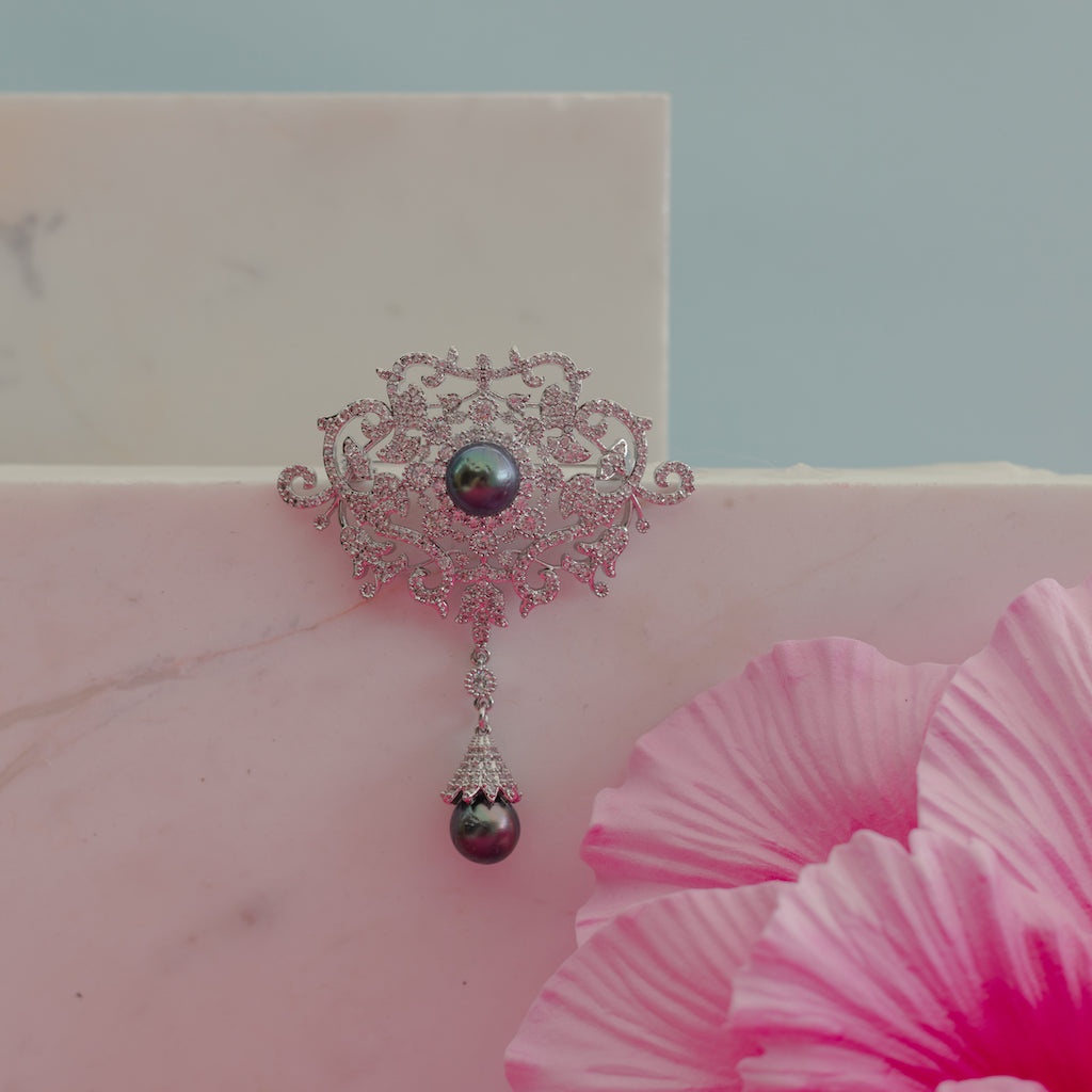 Elevate your ensemble with the captivating beauty of our Victoria Brooch. Thoughtfully crafted, combining the natural allure of lustrous Tahitian pearls with the radiant shimmer of polished silver detailing. The contrast between the deep, oceanic tones of the pearls and the brilliant sparkle of silver creates a look that is both modern and timeless.
