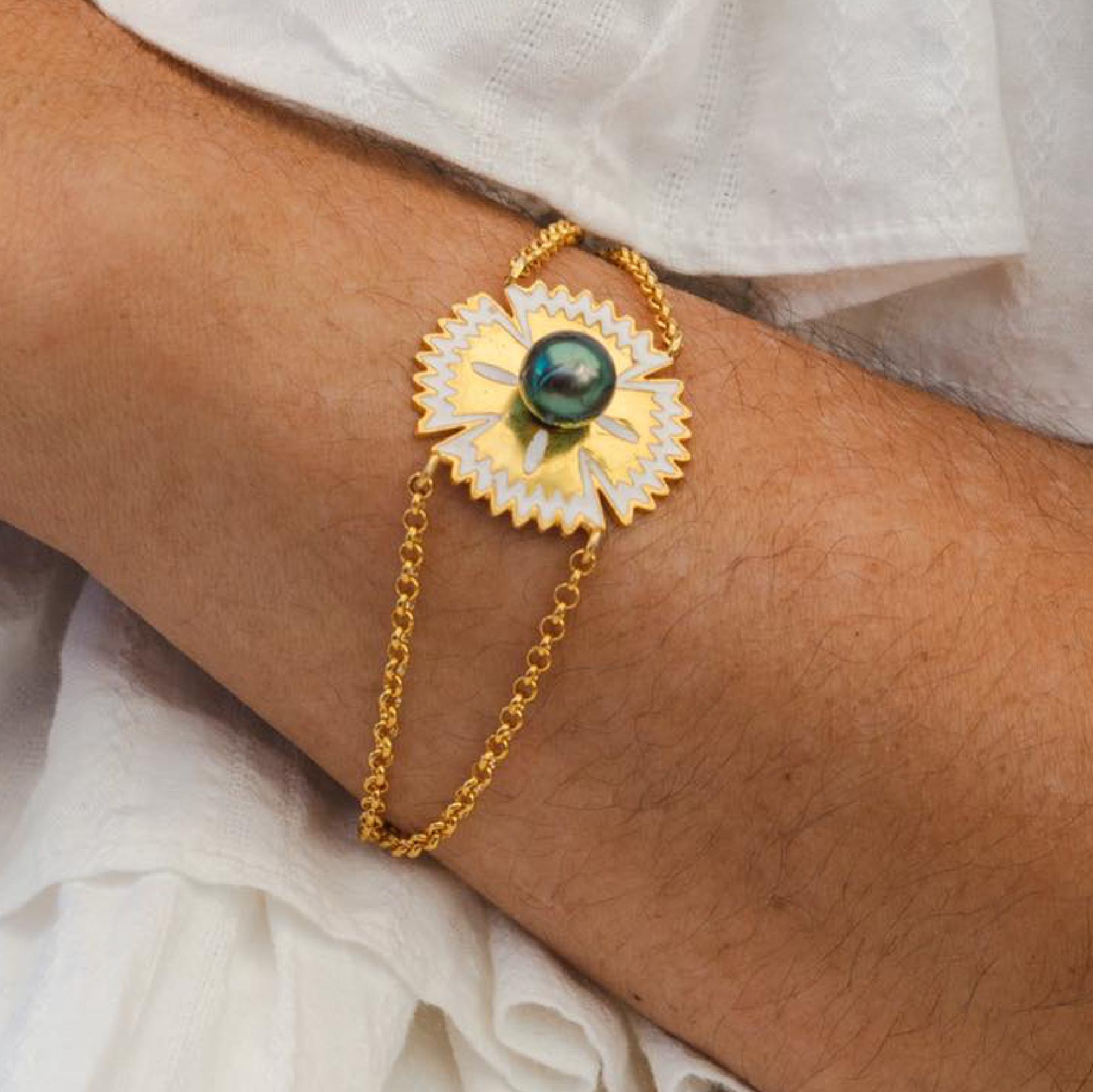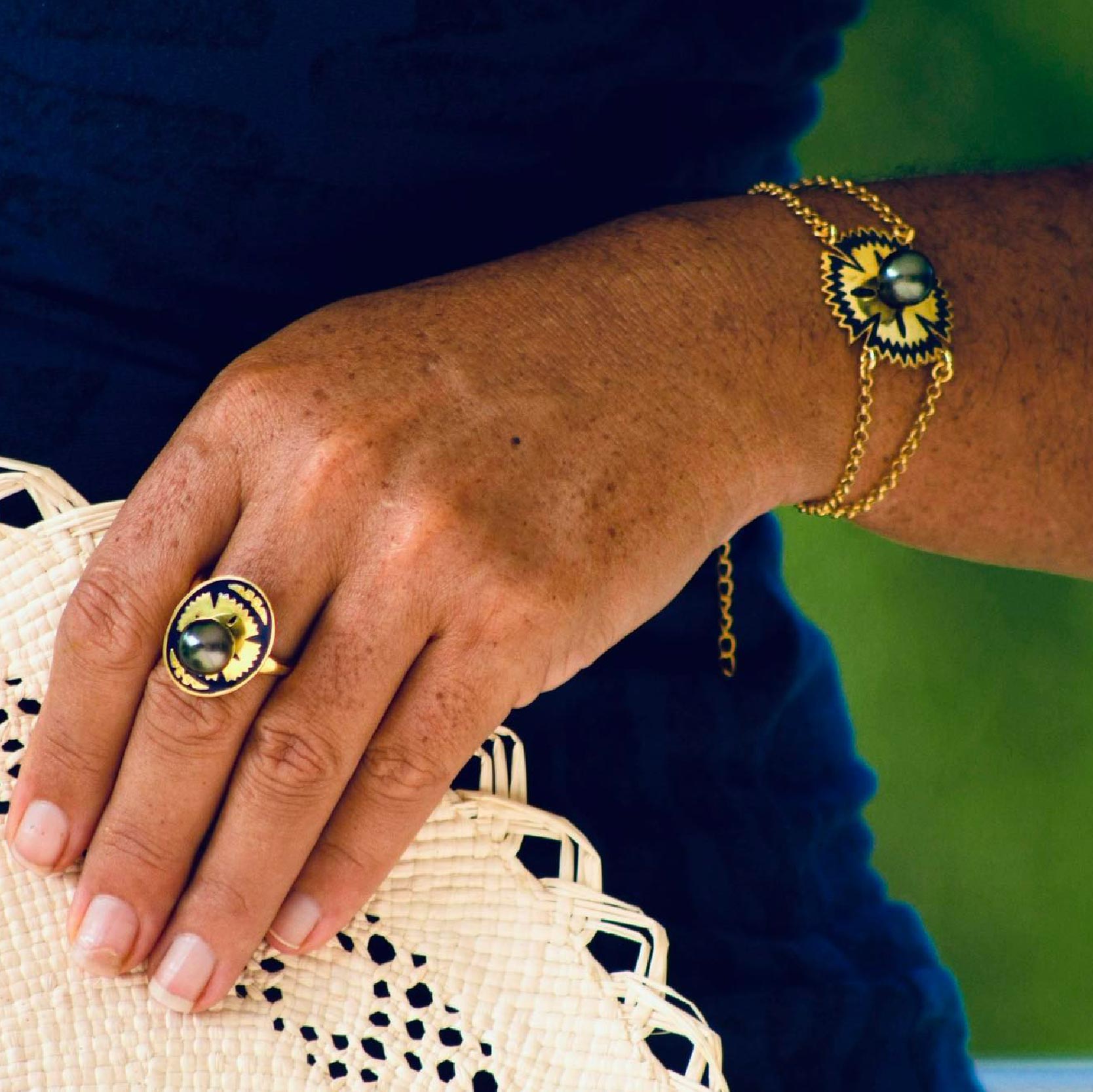 Our Camilla bracelet is inspired by Tapa cloth and your individuality. Pair it with your favourite pearl ring to mix and match your look.