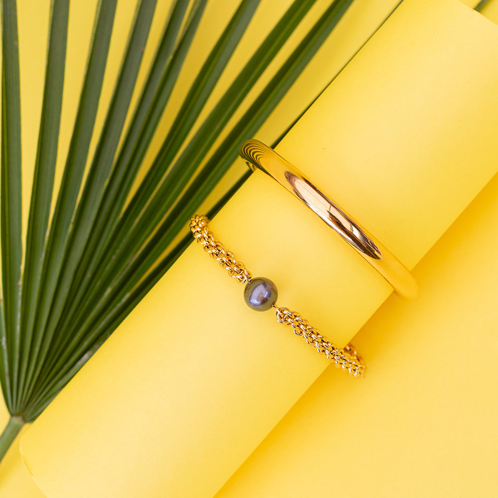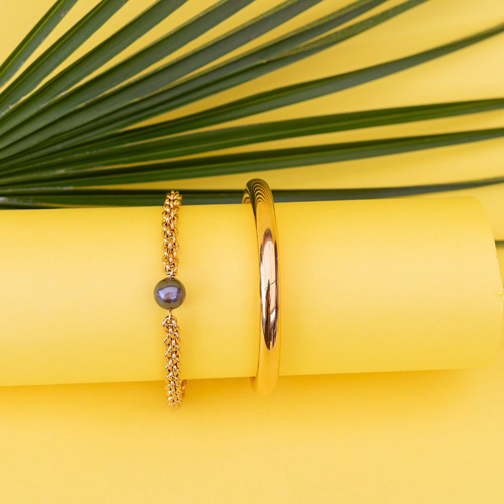 This chunky bracelet and necklace set is pure luxury with attitude. The bracelet features a luminous 9–10mm Tahitian pearl that anchors the look — powerful, polished, and impossible to miss. The bangle, with its solid 8mm thickness and 65mm inner diameter, brings that statement energy that says, “I didn’t come to blend in.”