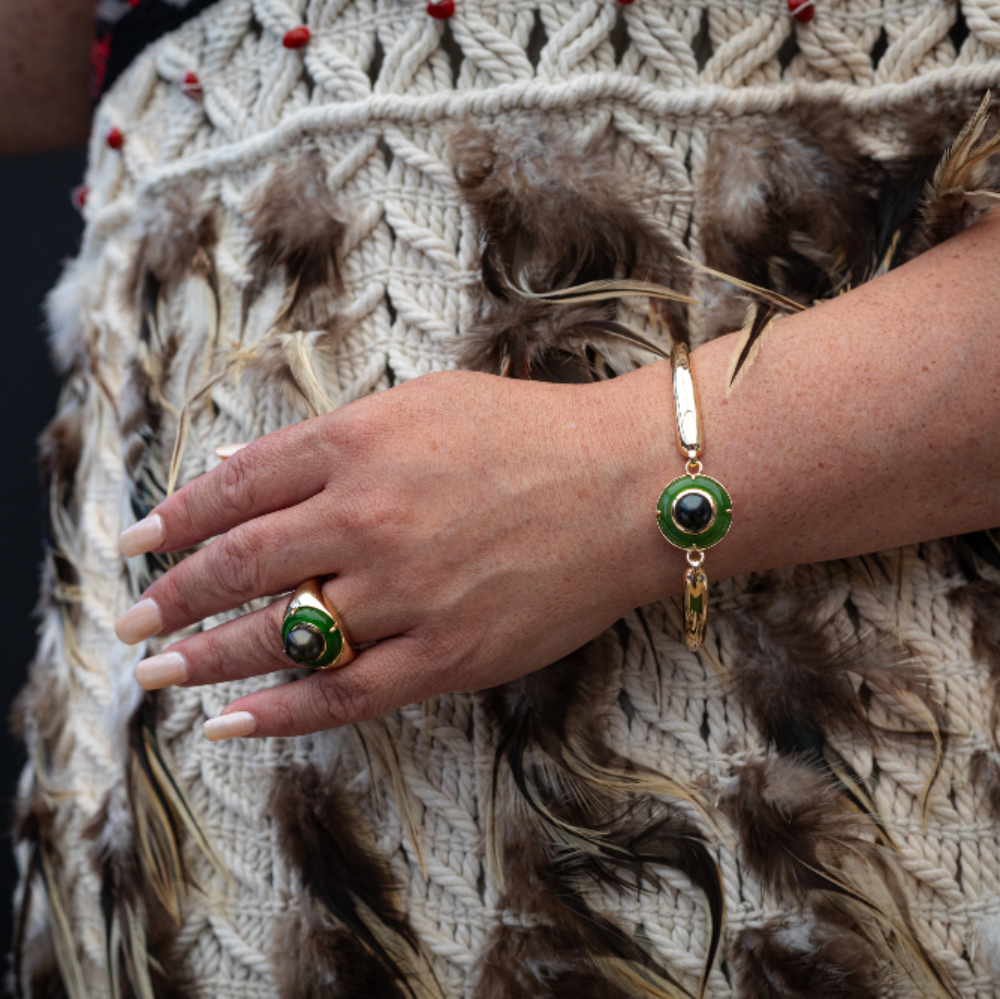 At its centre sits a Tahitian pearl, dark and radiant like the ocean it came from. It’s framed in a single porowhita of pounamu, hand-carved to honour your grounding in Aotearoa. This isn’t just detail — it’s direction. A reminder that even as life moves fast, you are still connected, still steady, still you.