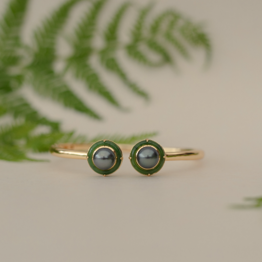 Inspired by the journey of the modern Polynesian woman who walks between her ancestral home and her chosen land, this open cuff design features two radiant Tahitian pearls—one at each end—nestled inside double halos of New Zealand greenstone. The pearls, dark and luminous, represent the beauty, wisdom, and resilience of your island heritage. The greenstone circles symbolise growth, connection, and protection—your future, your whānau, your purpose.