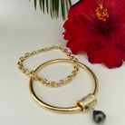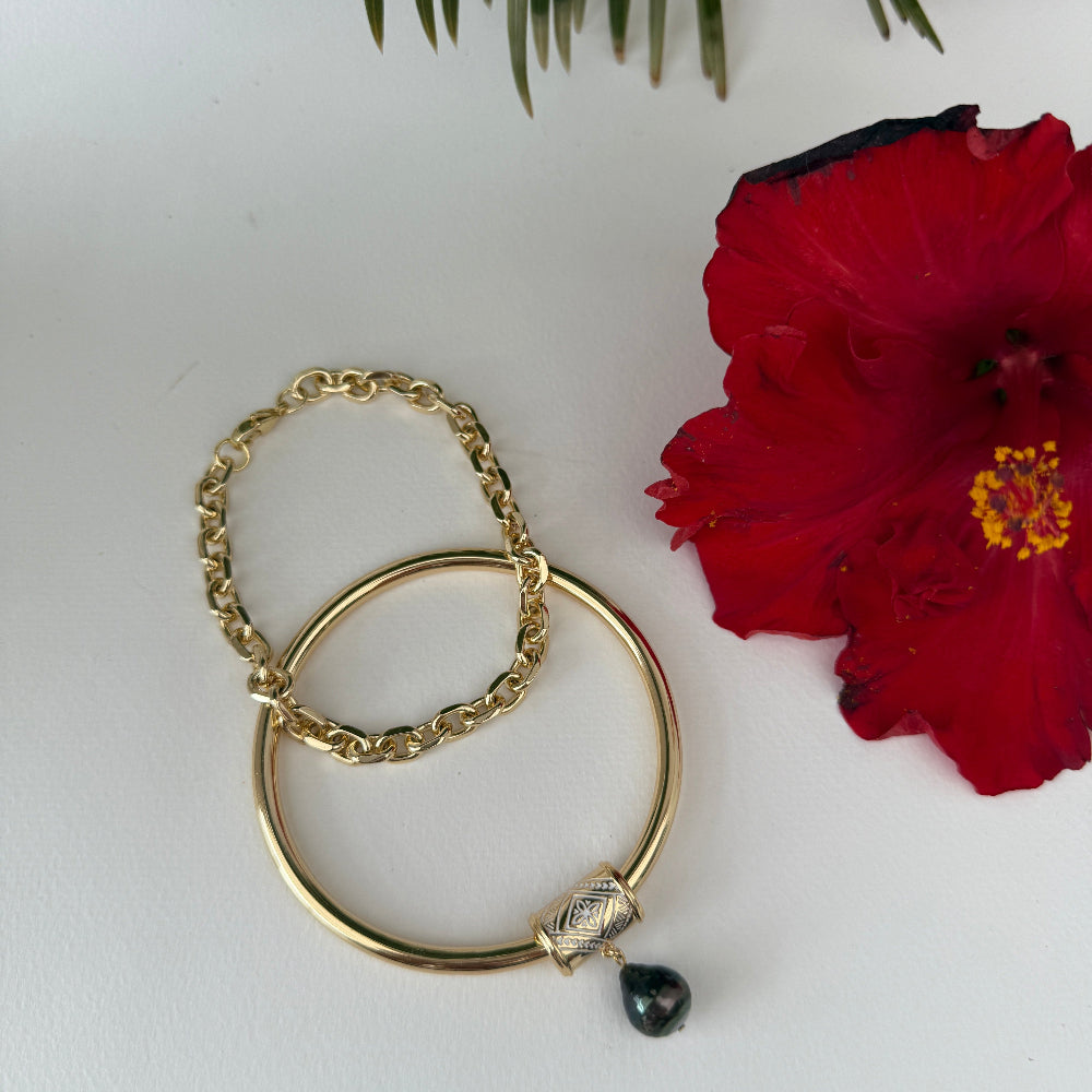 The Stacy Bracelet Set pairs a classic 23cm bracelet with a stunning 70mm bangle — thoughtfully designed for women who love meaningful details. The bangle features a Polynesian-inspired charm etched with traditional motifs, centred with a Frenchie penny for that perfect touch of heritage. From the charm hangs a single pearl, adding softness, movement, and that unmistakable island glow.