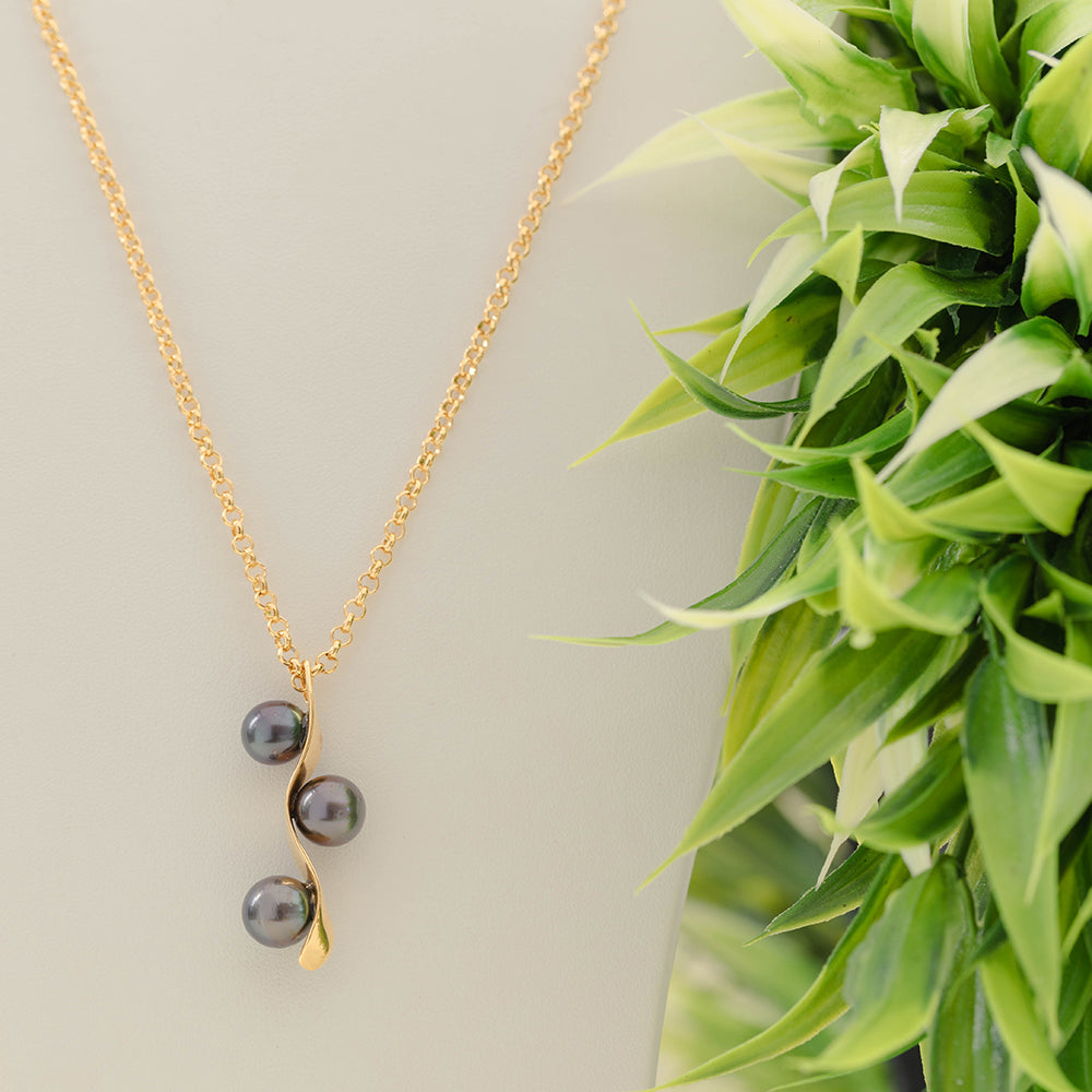 An elegantly curved silhouette of the Seville Necklace pendant is crowned with three iridescent Tahitian pearls, symbols of femininity, sisterhood and strength. It's a powerful tribute to Polynesian heritage and treasures of the Pacific.