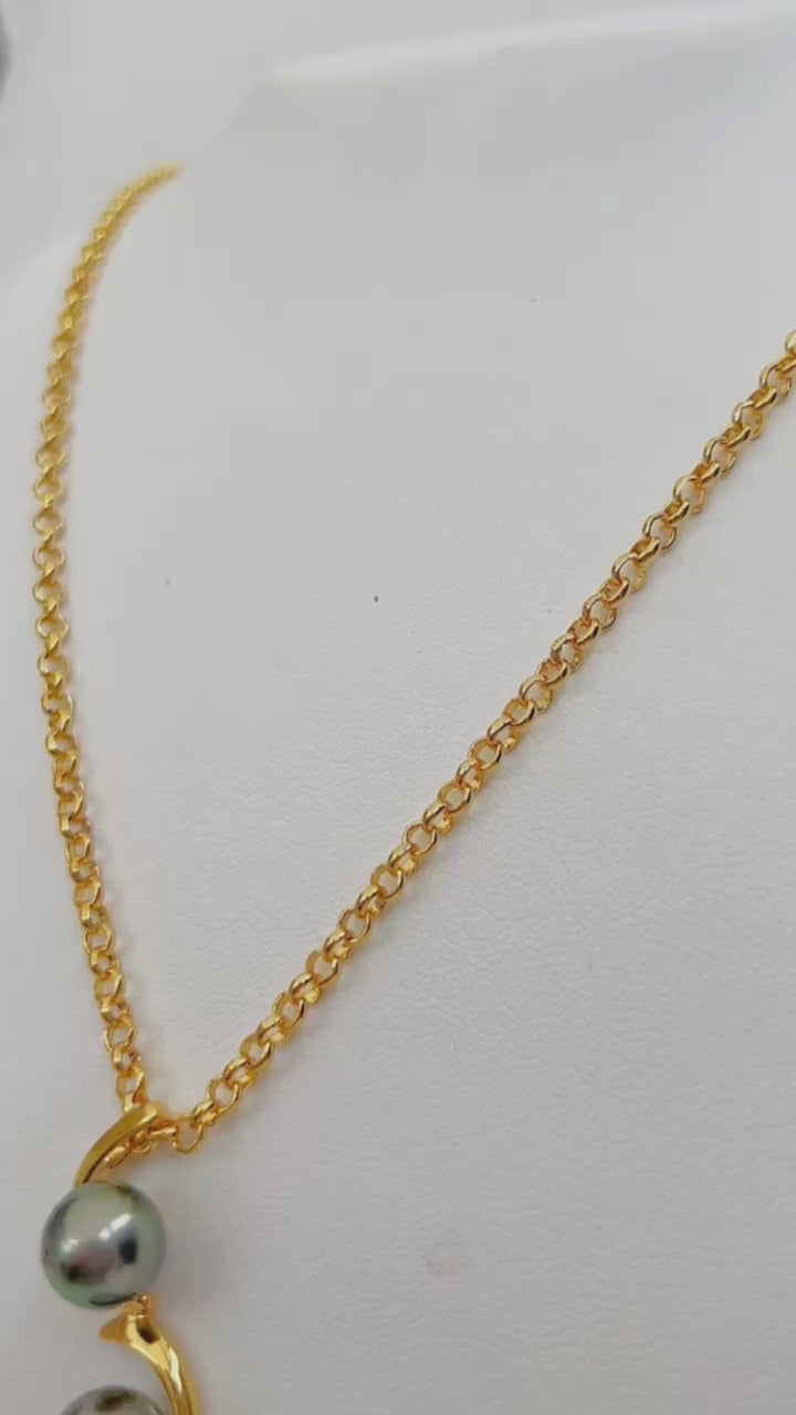 Two iridescent Tahitian pearls are cradled in slender crescent moon settings and strung from a sleek chain. An ultra feminine piece that pairs perfectly with abstract rings and eclectic bracelets from our collection.
