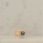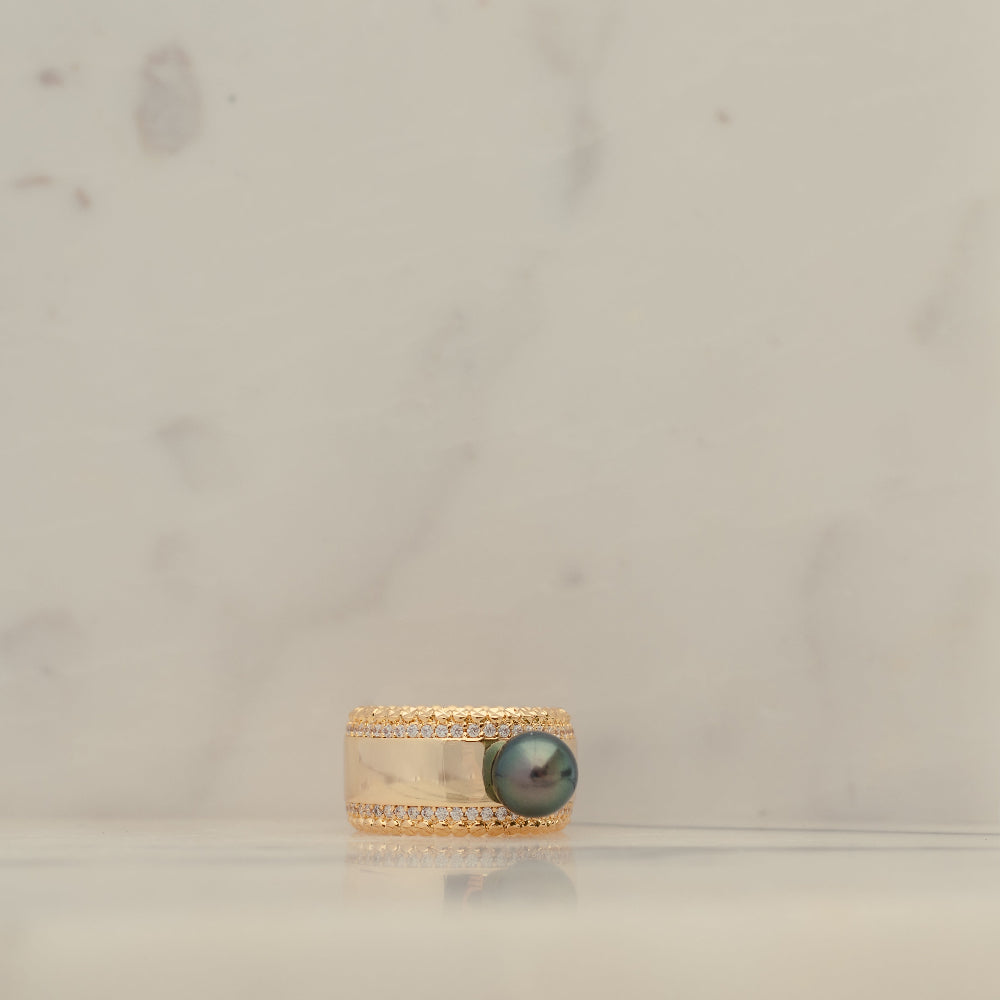 A wide gold band lined with rows of glittering stones — elegance with a sharp edge. And then there’s the Tahitian pearl, set like it knows it’s the star of the show. Rich, luminous, impossible to ignore.