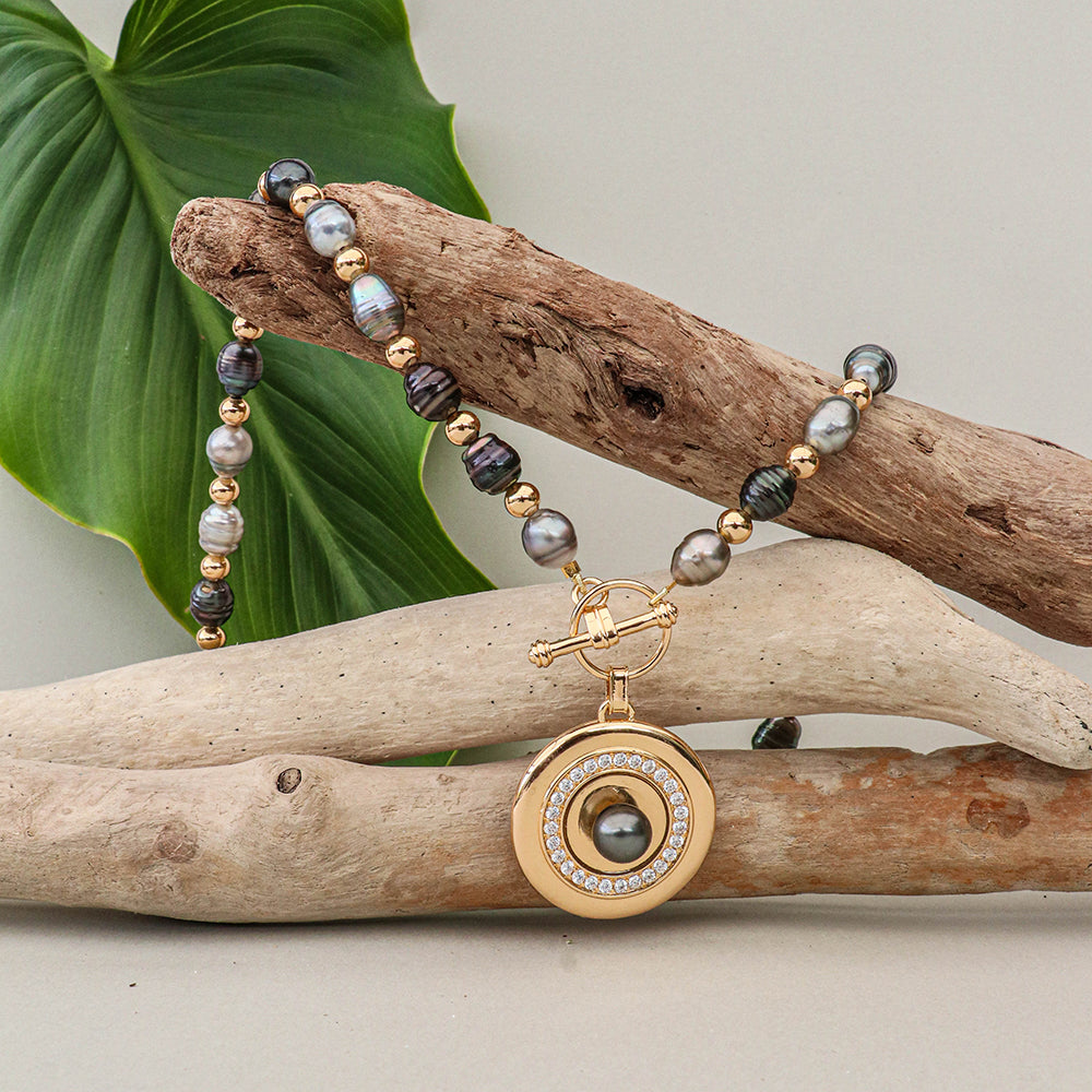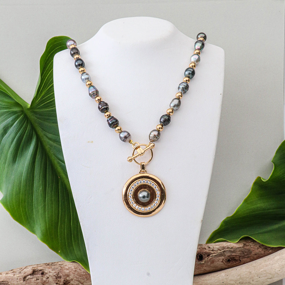 Hand-strung with Tahitian pearls and accented by glowing gold-filled beads, it’s a piece that mixes elegance with everyday wearability. The pearls themselves are low-grade, which means they carry more rings, ripples, and quirks — but that’s exactly what gives this necklace its character. Each pearl has a story, and together they create a strand that’s full of personality.
