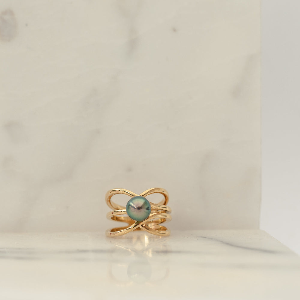 Golden bands swoop and curve like they were choreographed, framing a single, hypnotic Tahitian Pearl. This isn’t just any pearl—it’s the ocean’s mic drop. Mysterious, luminous, and born in the depths of French Polynesia, this Tahitian Pearl doesn’t whisper “luxury.” She sings it in perfect pitch.