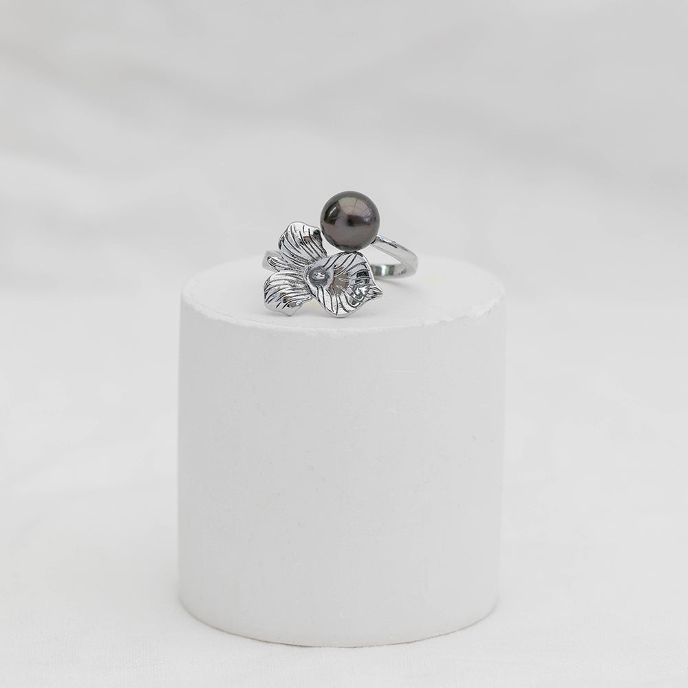 The Pua Ring embodies this ethos, blending the bold femininity of tropical orchids with the mystique of black Tahitian Pearls from our Orchid Collection.