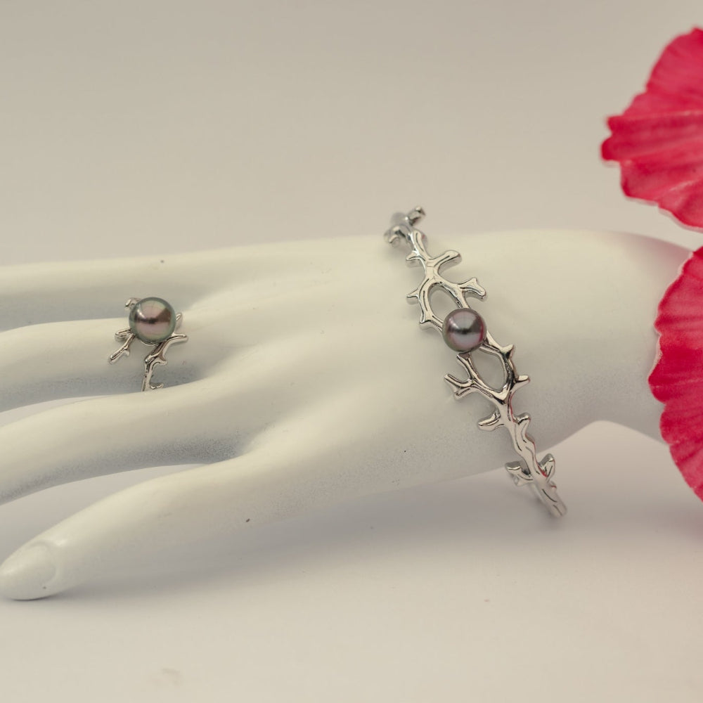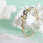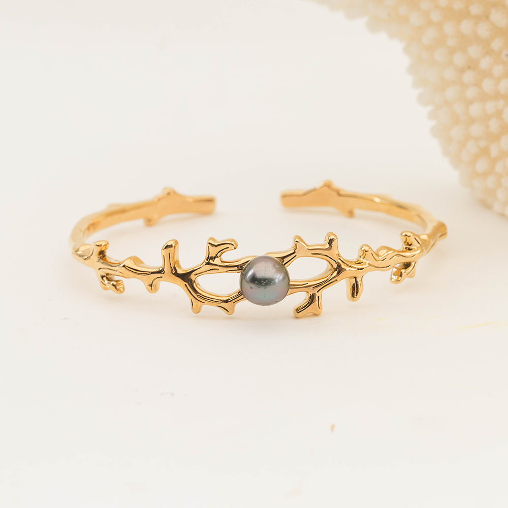 Embrace the strength of the ocean with our stunning Reef Guardian Cuff bangle. Intricate coral branch patterns dance across the surface, while a luminous Tahitian pearl serves as the centerpiece. The open design allows for easy wearing, adapting to your wrist like the sea adapts to the shore. This cuff isn't just an accessory – it's a golden reminder of your resilience and connection to your oceanic roots.