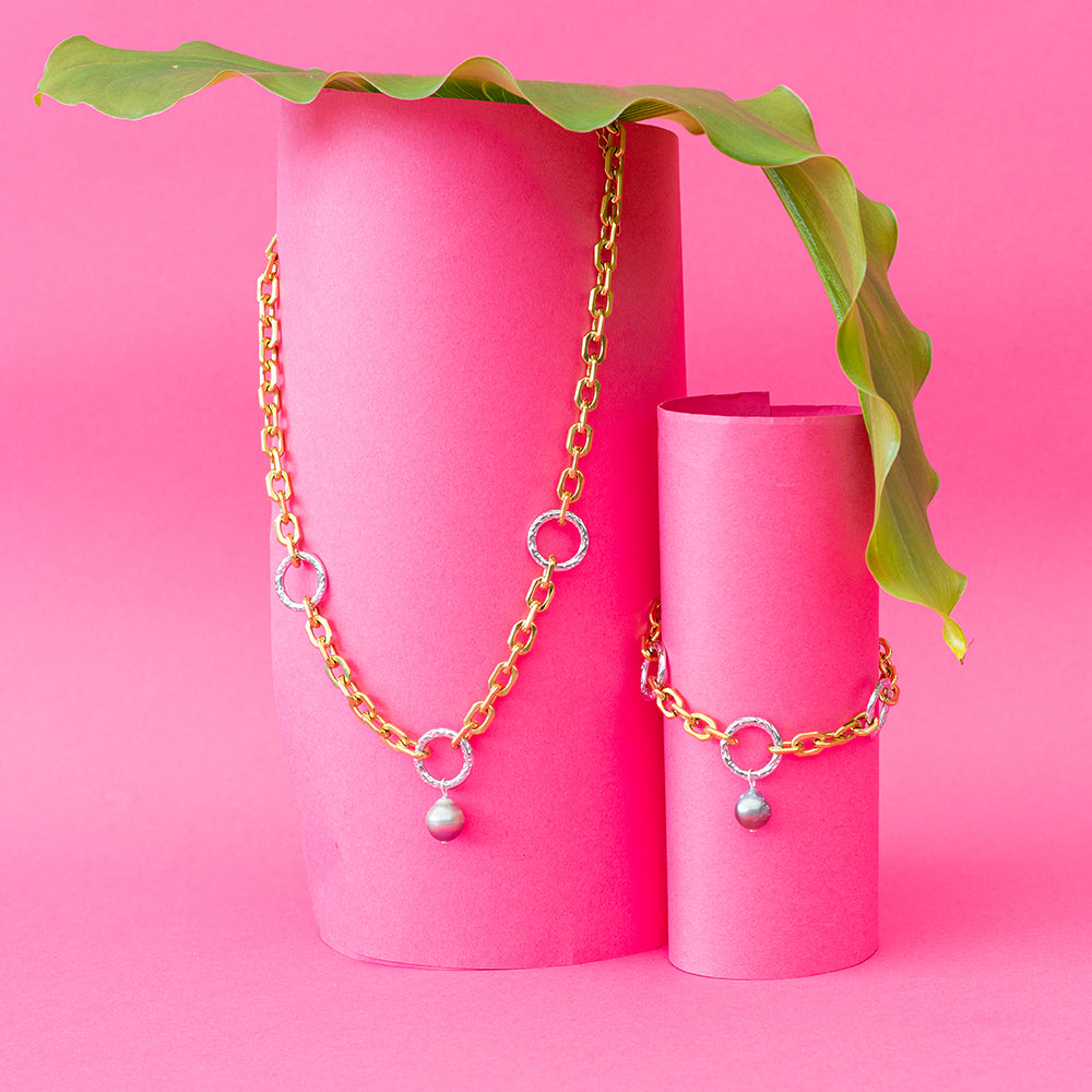 This two-tone set (a 50cm necklace and 24cm bracelet) mixes polished gold links with hammered circle connectorsthat catch the light in all the right ways. At the centre sits a round hammered circle finished with a single Tahitian pearl— a soft, glowing contrast that pulls the whole look together.