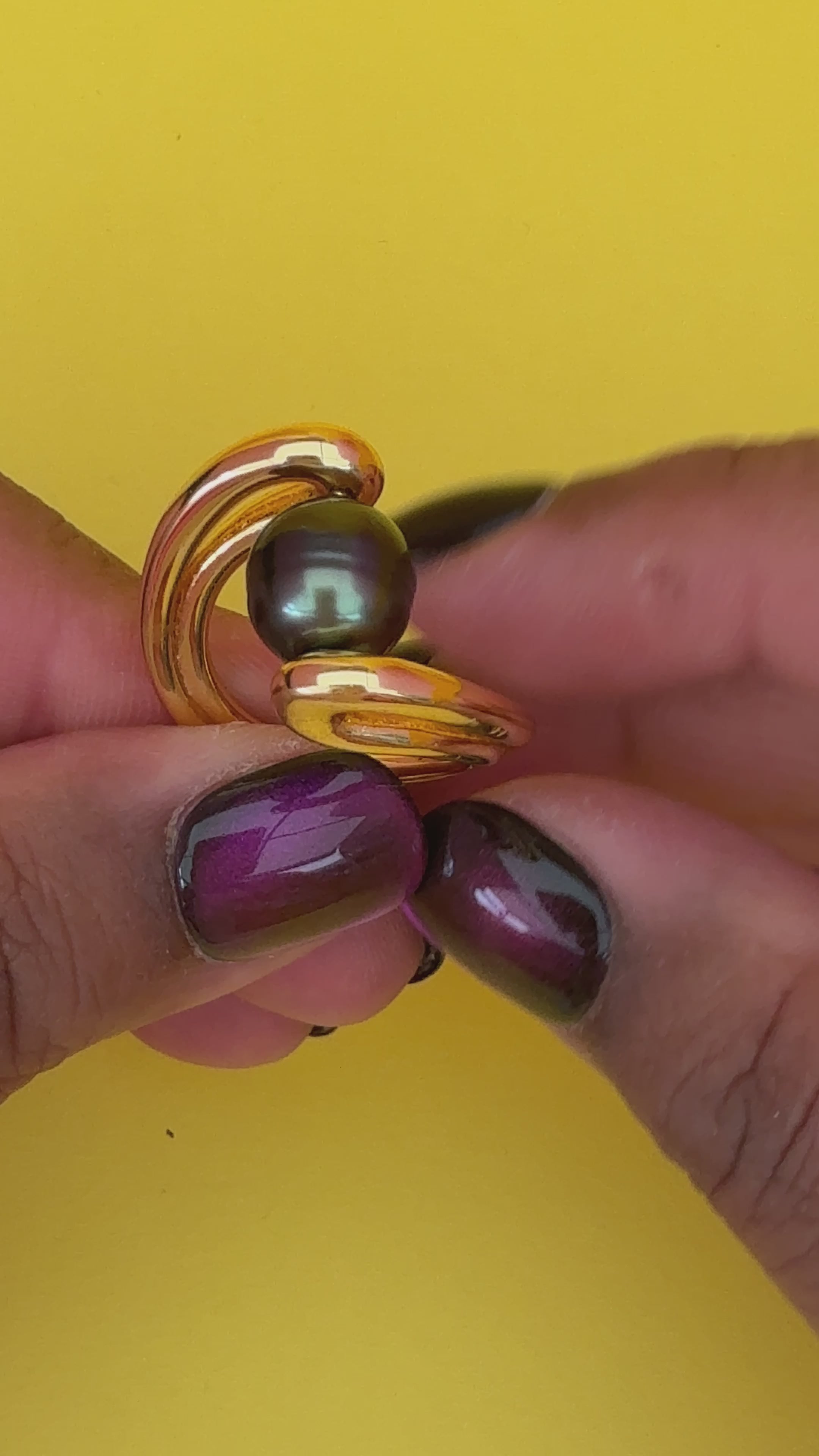 She’s one bold, sculptural statement — a chunky wrap of molten metal that flows gracefully around your finger like it was made just for you. The design curves and cradles a single Tahitian pearl, giving “effortlessly luxe” a whole new meaning.