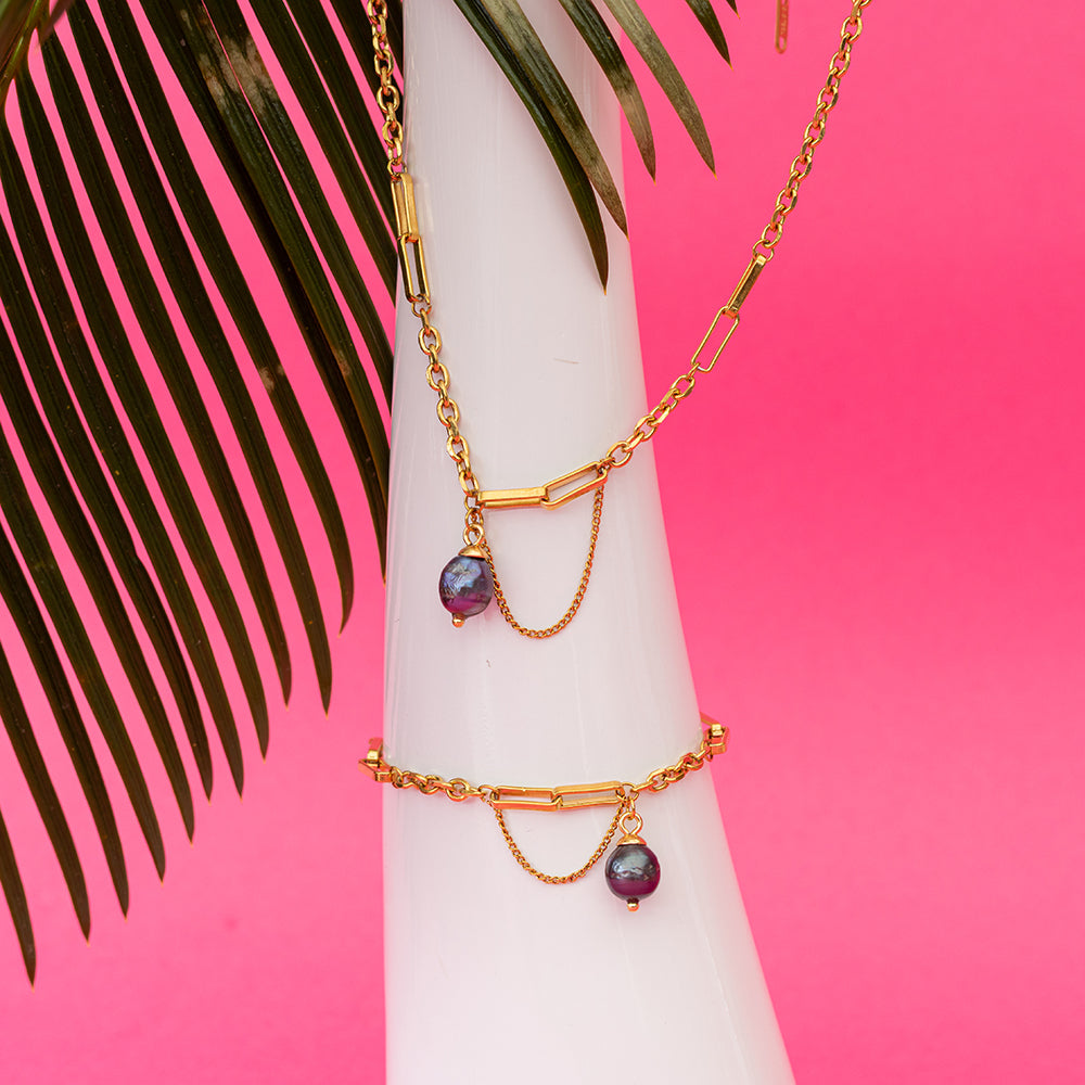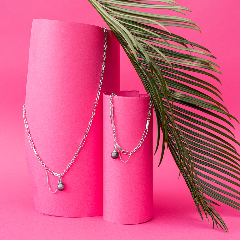 This necklace and bracelet set is a masterpiece of detail — featuring a mix of hammered oval links that shimmer with every move and elongated rectangular links that add just the right amount of edge. At the heart of the design hangs a single Tahitian pearl, effortlessly tying it all together with that soft island glow.