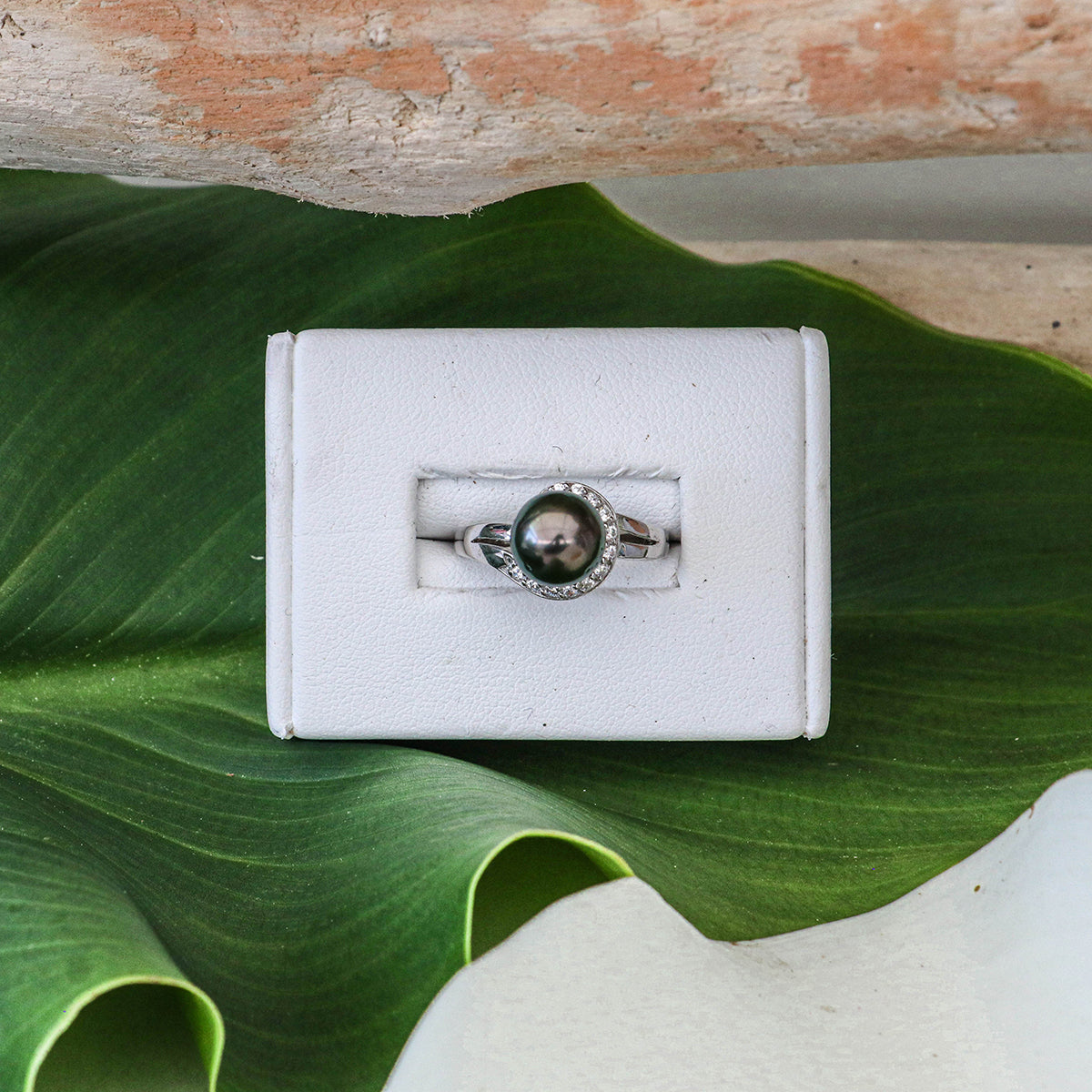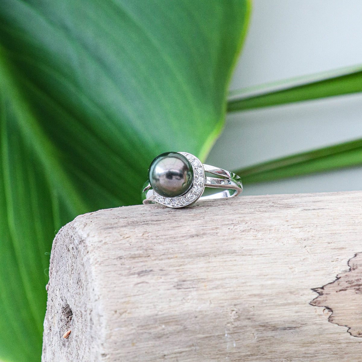 Alana, meaning “fair” in Hawaiian, captures the light in every way. The dazzling diamonds that swirl around the rich black pearl in the center symbolize your inner radiance, which shines even in the darkest times. The graceful curves of the band reflect the flowing energy of the Pacific, where life and love ebb and flow with grace. This ring honors the beautiful women of the Pacific who carry their traditions and wisdom with pride, embodying both elegance and strength.