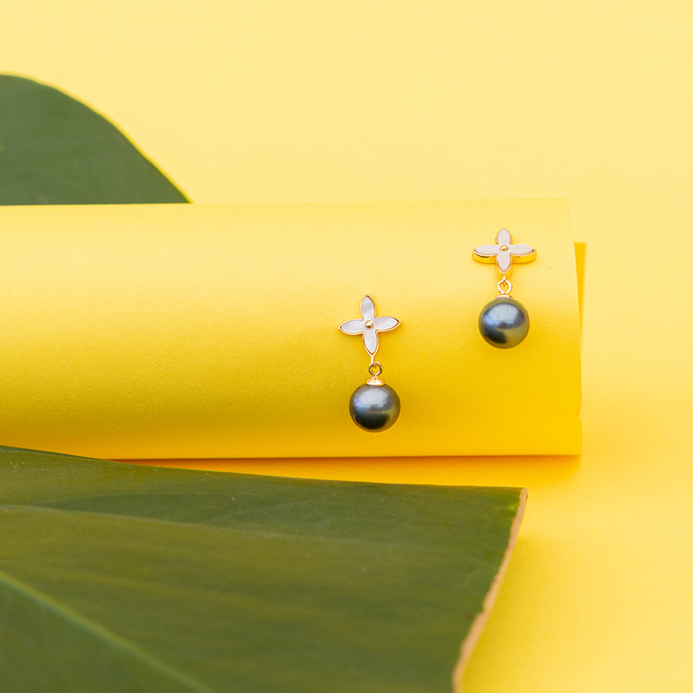 Shaped like the beloved tiare Māori flower, these dainty mother-of-pearl studs bloom softly against the ear, each finished with a radiant 9mm Tahitian pearl at the centre. They’re that perfect mix of cute and classy — understated enough for everyday wear, yet special enough to make you feel a little dressed up.