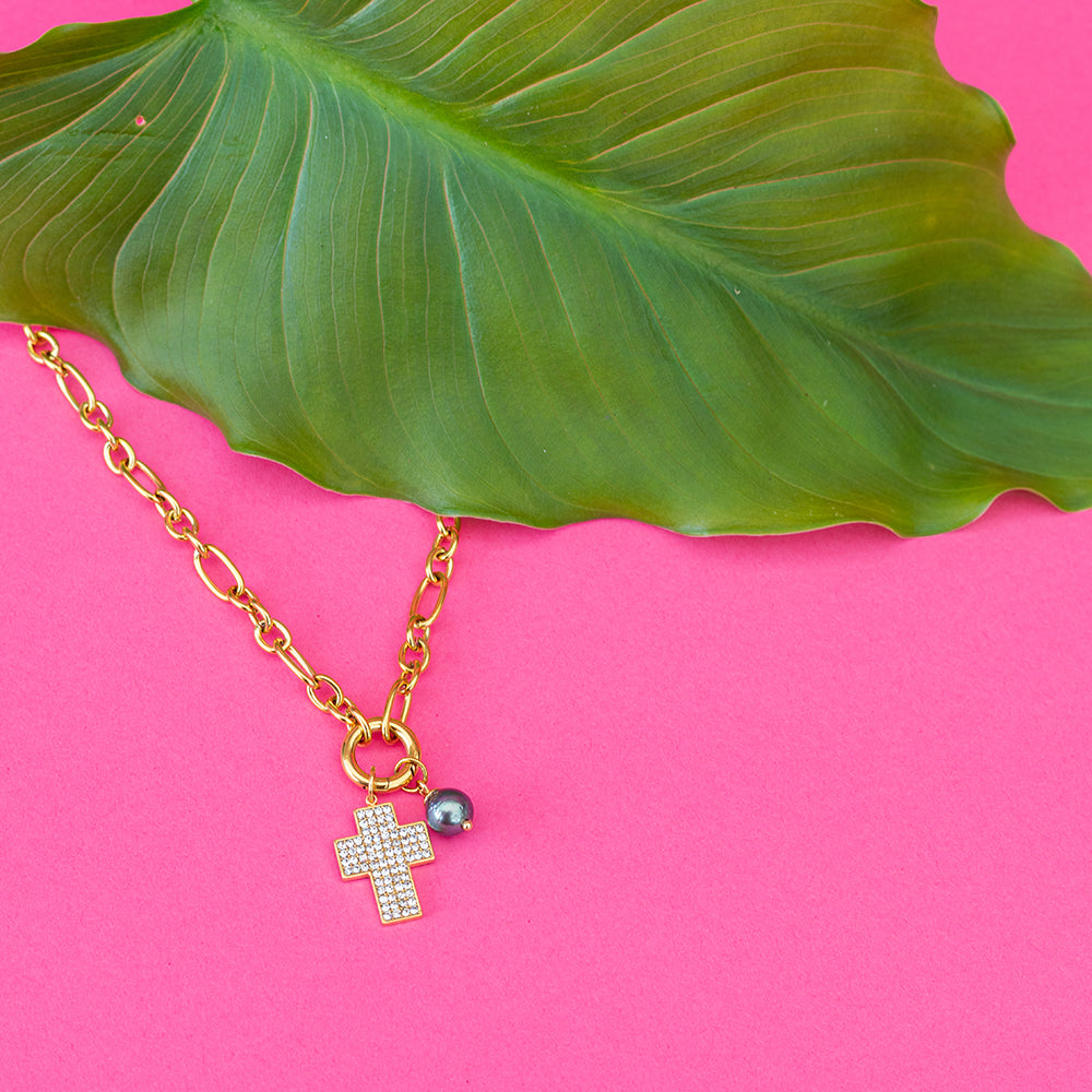 Now reimagined as a necklace (51cm) and bracelet (23cm) set, this iconic design keeps all the attitude of the original and turns it up a notch. The chunky chain is anchored by a dazzling bling cross, while a single 9mm Tahitian pearlbrings in that soft island glow — because balance is everything.