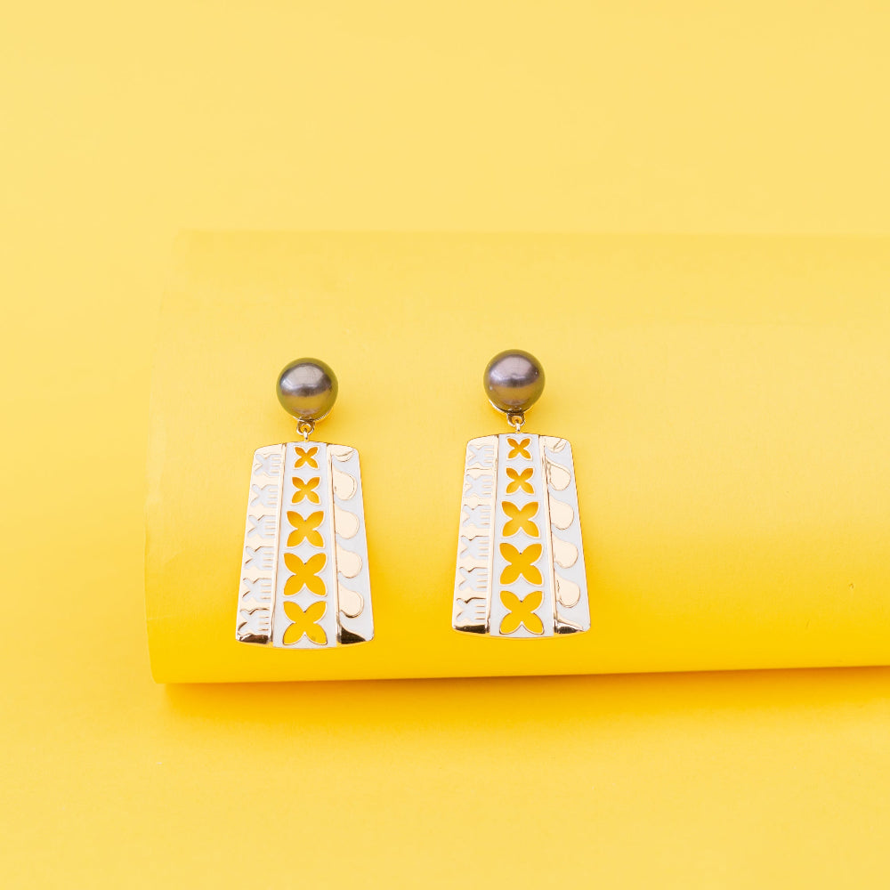 A smooth 9mm Tahitian pearl sits beautifully at the top, catching the light with that soft island glow. Below it, a gently moving rectangular charm dances with every turn of your head — etched with Pacific-inspired motifs that add meaning and movement in one graceful sweep.