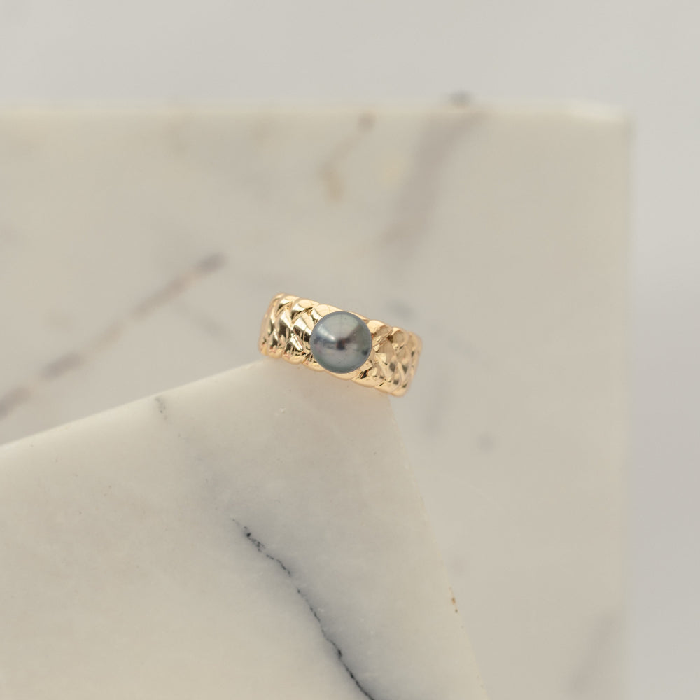 A gold band with a story in its texture — every curve, every facet catching the light like it was born to. And then… the pearl. Front and center. A Tahitian beauty that doesn’t whisper; it holds court.