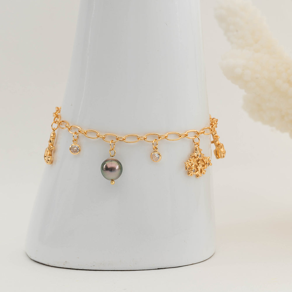 Delicate yet resilient, just like you. Our Mermaid bracelet strings together tiny coral-shaped charms and small Tahitian pearls on a chain. Each "charm" represents a challenge overcome, a lesson learned, a moment of growth. Wear it as a reminder of your journey and the strength you've gained along the way..
