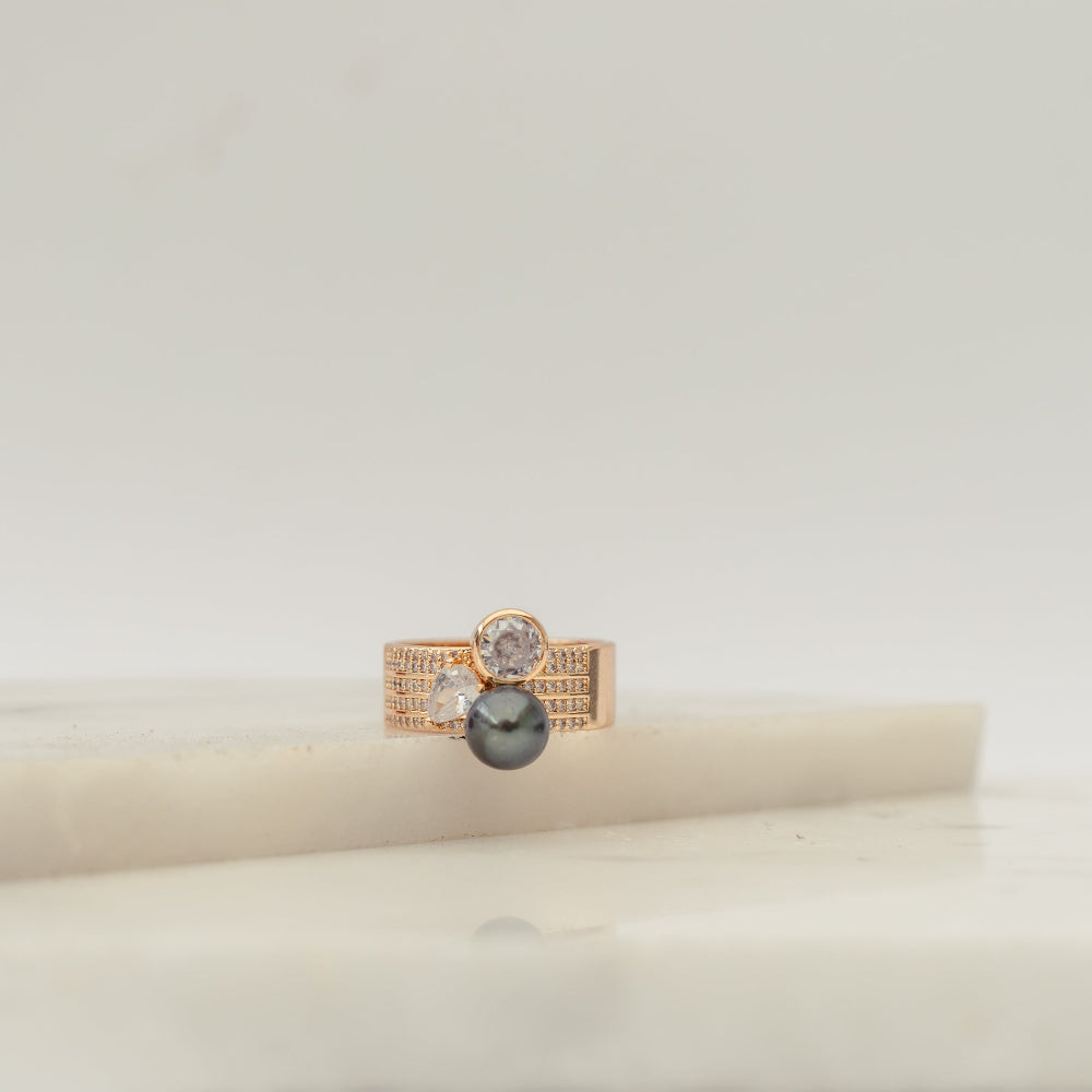 Three showstoppers in one: a bold rose gold band stacked with rows of sparkle, a luminous black pearl that owns the room, and two brilliant stones that catch the light—and your breath. It’s drama, elegance, and “where did you get that?” energy, all in one unapologetic statement.