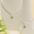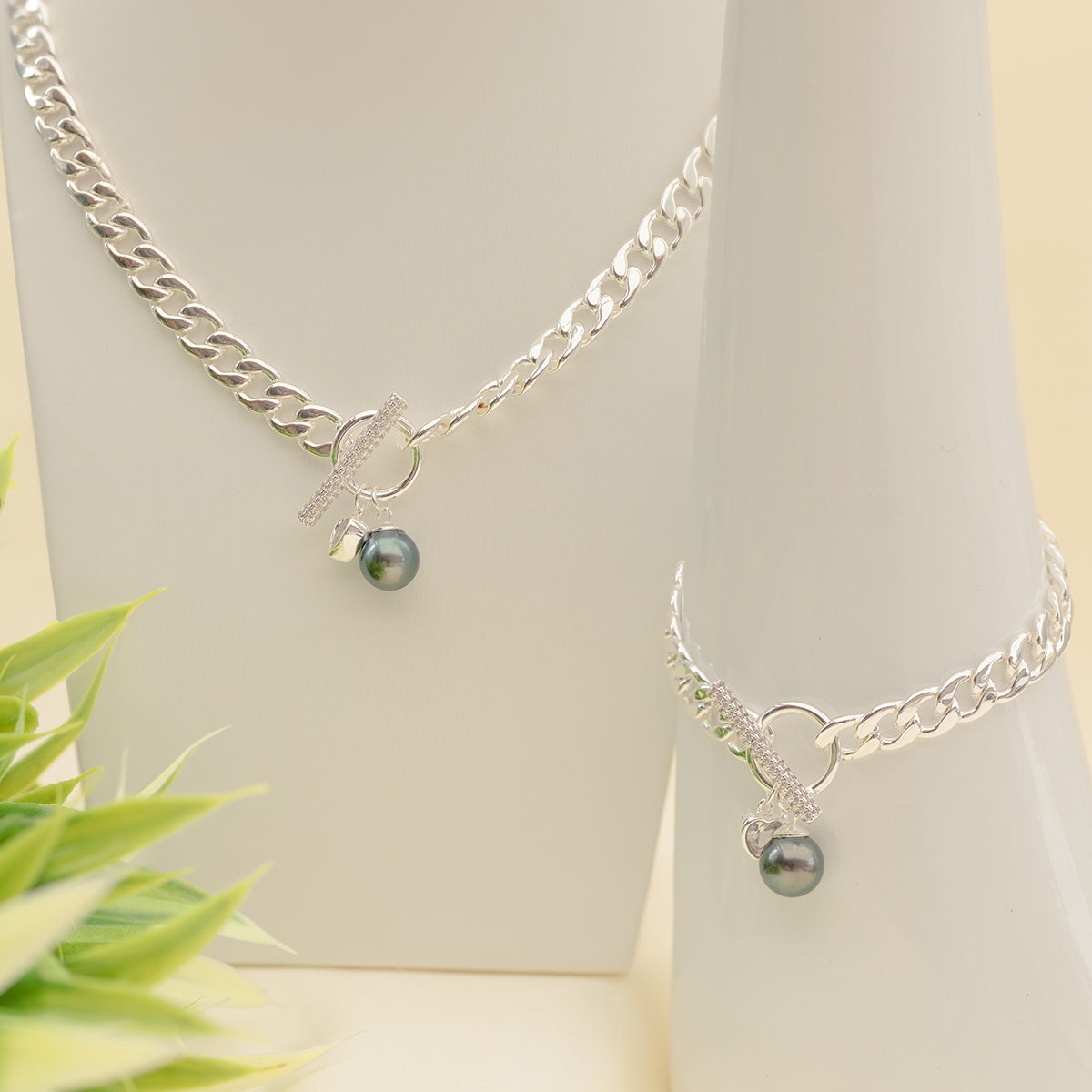A cuban chain set accented with a delicate heart and pearl charm and shimmering crystal accents. The perfect fusion of two opposing energies, it's a reminder that we need both strength and softness to succeed in life.