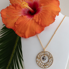 The Salusalu Necklace features a beautiful, openwork circular pendant with a gold-plated finish. At the heart of the design, a shimmering black pearl is held in place by the intricate garland pattern. This piece captures the essence of Fijian culture, representing the unending circle of friendship and an open-hearted way of life. It’s more than just a piece of jewelry; it’s a reflection of the pride and generosity of the Fijian people, carrying the spirit of a warm island welcome and a continuous invitation to return to the friendliest place on Earth.