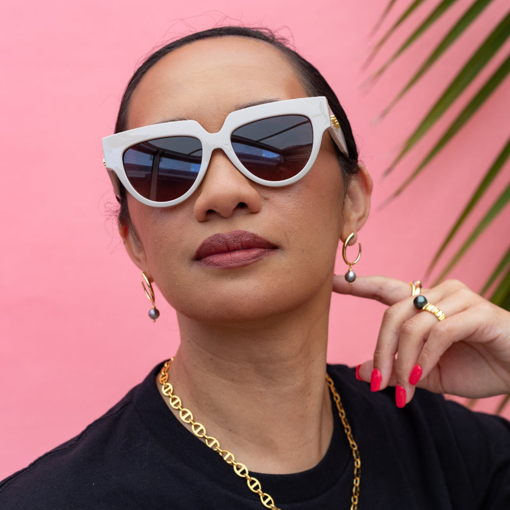 A quick glance over the top of her Sass Sunglasses, and the message is clear — she’s playful, confident, and a little bit cheeky.