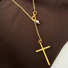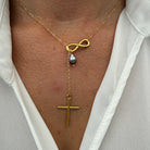 An infinity symbol sits at the heart of the piece — representing what has no end — with a pearl suspended gently beneath it, reminding you of your inherent worth. A delicate drop chain leads the eye downward to a cross, symbolising faith carried daily, not performed.